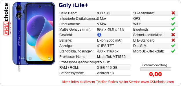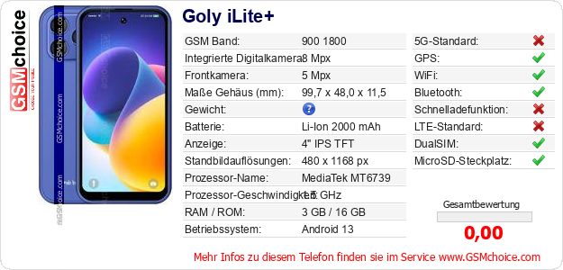 Hast du eigene Webseite? Willst du die Informationen über Standarddaten des Handys Goly iLite+ irgendwo veröffentlichen? Das ist sehr einfach. Du kannst das Bild herunterladen oder kopieren und auf der Webseite folgenden Code hinzufügen:Das Einfügen von diesem Code verursacht das Anzeigen von dem folgenden Bild: