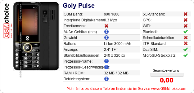 Hast du eigene Webseite? Willst du die Informationen über Standarddaten des Handys Goly Pulse irgendwo veröffentlichen? Das ist sehr einfach. Du kannst das Bild herunterladen oder kopieren und auf der Webseite folgenden Code hinzufügen:Das Einfügen von diesem Code verursacht das Anzeigen von dem folgenden Bild: