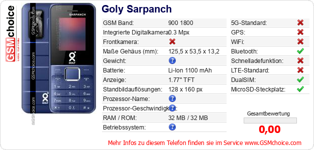 Hast du eigene Webseite? Willst du die Informationen über Standarddaten des Handys Goly Sarpanch irgendwo veröffentlichen? Das ist sehr einfach. Du kannst das Bild herunterladen oder kopieren und auf der Webseite folgenden Code hinzufügen:Das Einfügen von diesem Code verursacht das Anzeigen von dem folgenden Bild: