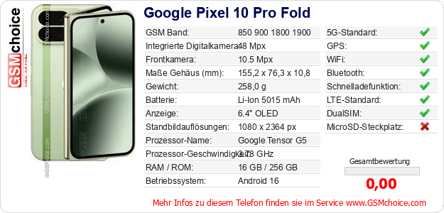 Daten des Mobiltelefons Google Pixel 10 Pro Fold auf Ihrer Seite