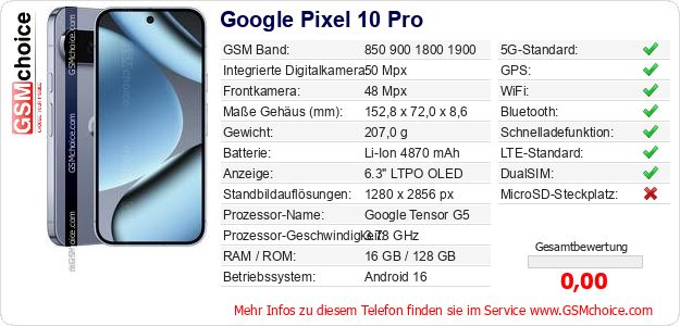Hast du eigene Webseite? Willst du die Informationen über Standarddaten des Handys Google Pixel 10 Pro irgendwo veröffentlichen? Das ist sehr einfach. Du kannst das Bild herunterladen oder kopieren und auf der Webseite folgenden Code hinzufügen:Das Einfügen von diesem Code verursacht das Anzeigen von dem folgenden Bild: