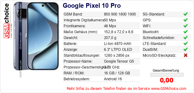 Daten des Mobiltelefons Google Pixel 10 Pro auf Ihrer Seite