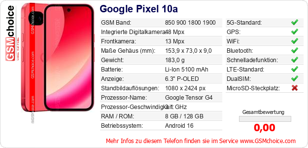 Hast du eigene Webseite? Willst du die Informationen über Standarddaten des Handys Google Pixel 10a irgendwo veröffentlichen? Das ist sehr einfach. Du kannst das Bild herunterladen oder kopieren und auf der Webseite folgenden Code hinzufügen:Das Einfügen von diesem Code verursacht das Anzeigen von dem folgenden Bild: