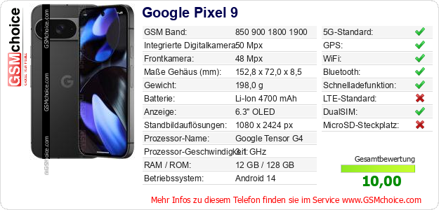 Hast du eigene Webseite? Willst du die Informationen über Standarddaten des Handys Google Pixel 9 irgendwo veröffentlichen? Das ist sehr einfach. Du kannst das Bild herunterladen oder kopieren und auf der Webseite folgenden Code hinzufügen:Das Einfügen von diesem Code verursacht das Anzeigen von dem folgenden Bild: