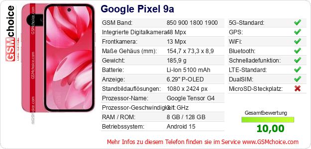 Hast du eigene Webseite? Willst du die Informationen über Standarddaten des Handys Google Pixel 9a irgendwo veröffentlichen? Das ist sehr einfach. Du kannst das Bild herunterladen oder kopieren und auf der Webseite folgenden Code hinzufügen:Das Einfügen von diesem Code verursacht das Anzeigen von dem folgenden Bild: