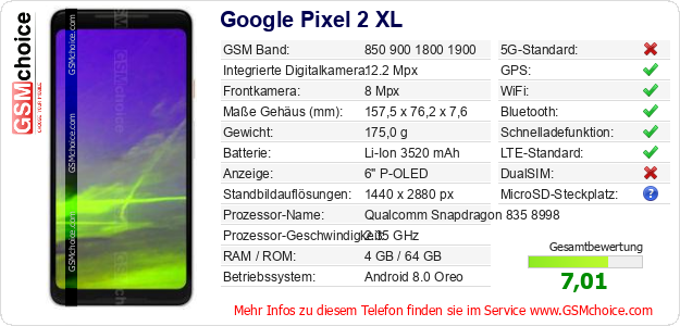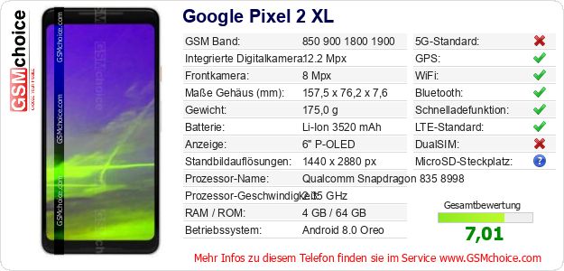 Hast du eigene Webseite? Willst du die Informationen über Standarddaten des Handys Google Pixel 2 XL irgendwo veröffentlichen? Das ist sehr einfach. Du kannst das Bild herunterladen oder kopieren und auf der Webseite folgenden Code hinzufügen:Das Einfügen von diesem Code verursacht das Anzeigen von dem folgenden Bild: