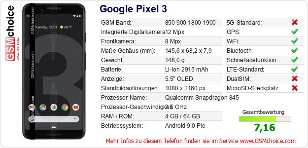 Hast du eigene Webseite? Willst du die Informationen über Standarddaten des Handys Google Pixel 3 irgendwo veröffentlichen? Das ist sehr einfach. Du kannst das Bild herunterladen oder kopieren und auf der Webseite folgenden Code hinzufügen:Das Einfügen von diesem Code verursacht das Anzeigen von dem folgenden Bild: