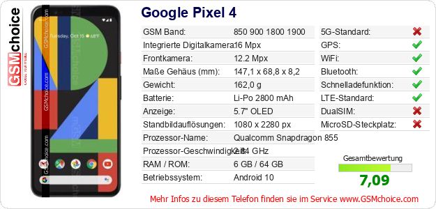 Hast du eigene Webseite? Willst du die Informationen über Standarddaten des Handys Google Pixel 4 irgendwo veröffentlichen? Das ist sehr einfach. Du kannst das Bild herunterladen oder kopieren und auf der Webseite folgenden Code hinzufügen:Das Einfügen von diesem Code verursacht das Anzeigen von dem folgenden Bild: