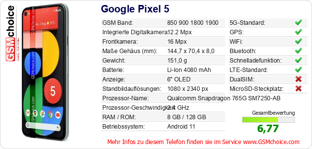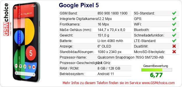 Hast du eigene Webseite? Willst du die Informationen über Standarddaten des Handys Google Pixel 5 irgendwo veröffentlichen? Das ist sehr einfach. Du kannst das Bild herunterladen oder kopieren und auf der Webseite folgenden Code hinzufügen:Das Einfügen von diesem Code verursacht das Anzeigen von dem folgenden Bild: