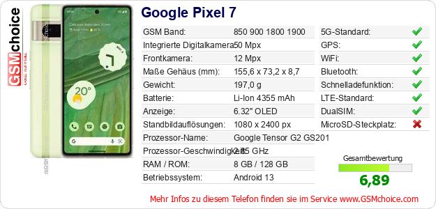 Hast du eigene Webseite? Willst du die Informationen über Standarddaten des Handys Google Pixel 7 irgendwo veröffentlichen? Das ist sehr einfach. Du kannst das Bild herunterladen oder kopieren und auf der Webseite folgenden Code hinzufügen:Das Einfügen von diesem Code verursacht das Anzeigen von dem folgenden Bild: