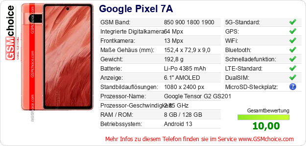 Hast du eigene Webseite? Willst du die Informationen über Standarddaten des Handys Google Pixel 7A irgendwo veröffentlichen? Das ist sehr einfach. Du kannst das Bild herunterladen oder kopieren und auf der Webseite folgenden Code hinzufügen:Das Einfügen von diesem Code verursacht das Anzeigen von dem folgenden Bild:
