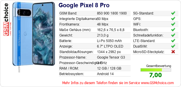 Hast du eigene Webseite? Willst du die Informationen über Standarddaten des Handys Google Pixel 8 Pro irgendwo veröffentlichen? Das ist sehr einfach. Du kannst das Bild herunterladen oder kopieren und auf der Webseite folgenden Code hinzufügen:Das Einfügen von diesem Code verursacht das Anzeigen von dem folgenden Bild: