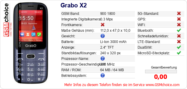 Hast du eigene Webseite? Willst du die Informationen über Standarddaten des Handys Grabo X2 irgendwo veröffentlichen? Das ist sehr einfach. Du kannst das Bild herunterladen oder kopieren und auf der Webseite folgenden Code hinzufügen:Das Einfügen von diesem Code verursacht das Anzeigen von dem folgenden Bild:
