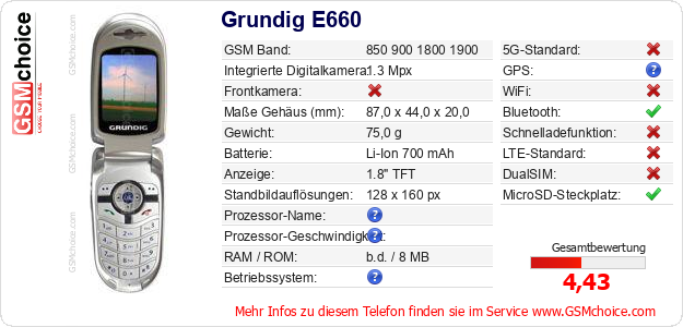Hast du eigene Webseite? Willst du die Informationen über Standarddaten des Handys Grundig E660 irgendwo veröffentlichen? Das ist sehr einfach. Du kannst das Bild herunterladen oder kopieren und auf der Webseite folgenden Code hinzufügen:Das Einfügen von diesem Code verursacht das Anzeigen von dem folgenden Bild: