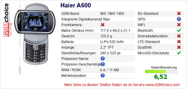 Hast du eigene Webseite? Willst du die Informationen über Standarddaten des Handys Haier A600 irgendwo veröffentlichen? Das ist sehr einfach. Du kannst das Bild herunterladen oder kopieren und auf der Webseite folgenden Code hinzufügen:Das Einfügen von diesem Code verursacht das Anzeigen von dem folgenden Bild: