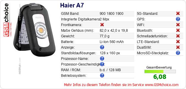 Hast du eigene Webseite? Willst du die Informationen über Standarddaten des Handys Haier A7 irgendwo veröffentlichen? Das ist sehr einfach. Du kannst das Bild herunterladen oder kopieren und auf der Webseite folgenden Code hinzufügen:Das Einfügen von diesem Code verursacht das Anzeigen von dem folgenden Bild: