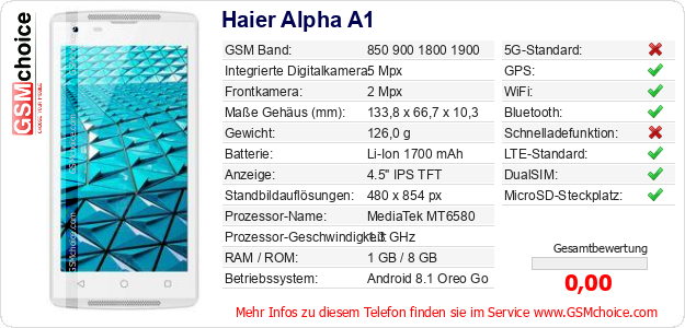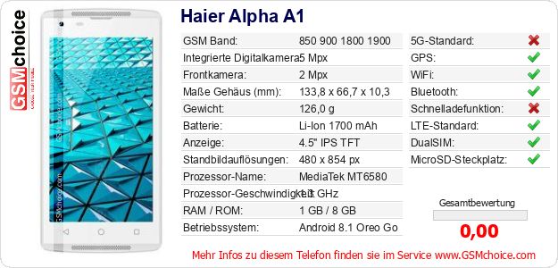 Hast du eigene Webseite? Willst du die Informationen über Standarddaten des Handys Haier Alpha A1 irgendwo veröffentlichen? Das ist sehr einfach. Du kannst das Bild herunterladen oder kopieren und auf der Webseite folgenden Code hinzufügen:Das Einfügen von diesem Code verursacht das Anzeigen von dem folgenden Bild:
