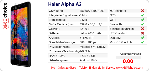 Hast du eigene Webseite? Willst du die Informationen über Standarddaten des Handys Haier Alpha A2 irgendwo veröffentlichen? Das ist sehr einfach. Du kannst das Bild herunterladen oder kopieren und auf der Webseite folgenden Code hinzufügen:Das Einfügen von diesem Code verursacht das Anzeigen von dem folgenden Bild: