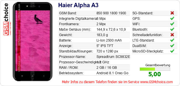 Hast du eigene Webseite? Willst du die Informationen über Standarddaten des Handys Haier Alpha A3 irgendwo veröffentlichen? Das ist sehr einfach. Du kannst das Bild herunterladen oder kopieren und auf der Webseite folgenden Code hinzufügen:Das Einfügen von diesem Code verursacht das Anzeigen von dem folgenden Bild: