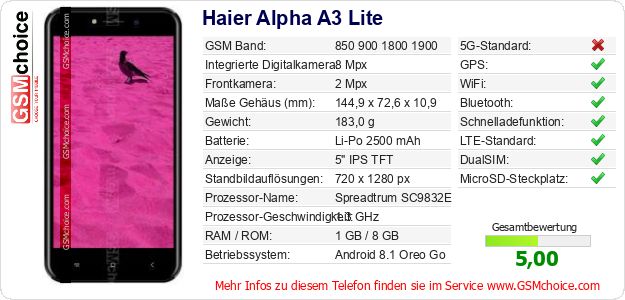 Hast du eigene Webseite? Willst du die Informationen über Standarddaten des Handys Haier Alpha A3 Lite irgendwo veröffentlichen? Das ist sehr einfach. Du kannst das Bild herunterladen oder kopieren und auf der Webseite folgenden Code hinzufügen:Das Einfügen von diesem Code verursacht das Anzeigen von dem folgenden Bild: