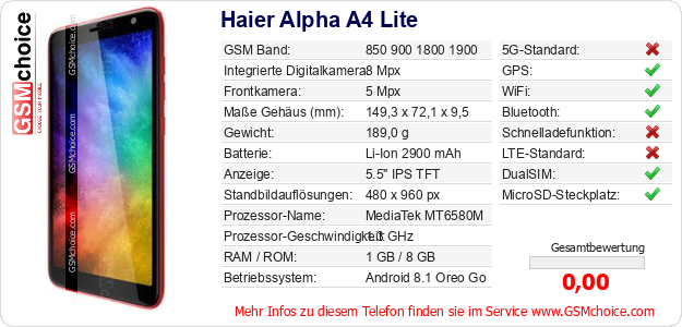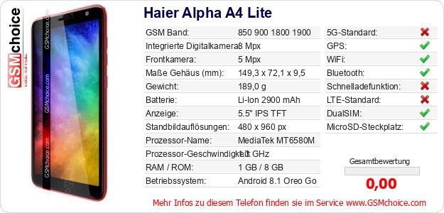 Daten des Mobiltelefons Haier Alpha A4 Lite auf Ihrer Seite