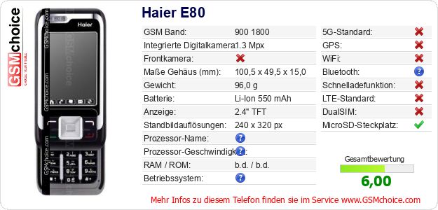 Hast du eigene Webseite? Willst du die Informationen über Standarddaten des Handys Haier E80 irgendwo veröffentlichen? Das ist sehr einfach. Du kannst das Bild herunterladen oder kopieren und auf der Webseite folgenden Code hinzufügen:Das Einfügen von diesem Code verursacht das Anzeigen von dem folgenden Bild: