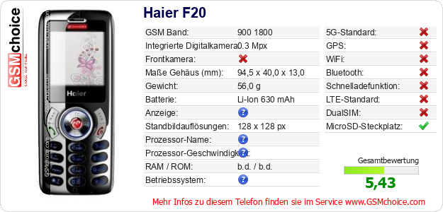Hast du eigene Webseite? Willst du die Informationen über Standarddaten des Handys Haier F20 irgendwo veröffentlichen? Das ist sehr einfach. Du kannst das Bild herunterladen oder kopieren und auf der Webseite folgenden Code hinzufügen:Das Einfügen von diesem Code verursacht das Anzeigen von dem folgenden Bild: