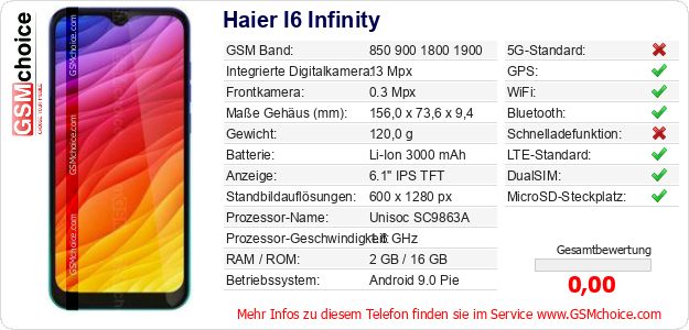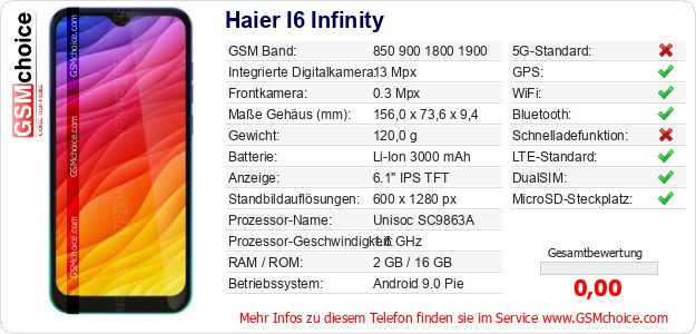 Hast du eigene Webseite? Willst du die Informationen über Standarddaten des Handys Haier I6 Infinity irgendwo veröffentlichen? Das ist sehr einfach. Du kannst das Bild herunterladen oder kopieren und auf der Webseite folgenden Code hinzufügen:Das Einfügen von diesem Code verursacht das Anzeigen von dem folgenden Bild: