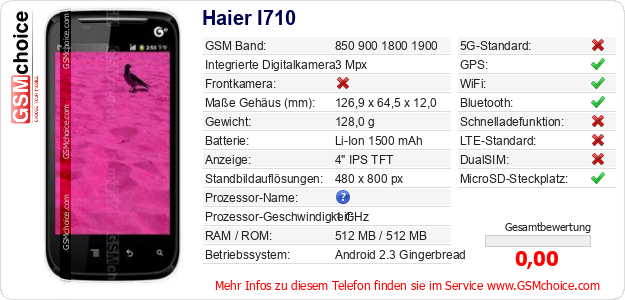 Hast du eigene Webseite? Willst du die Informationen über Standarddaten des Handys Haier I710 irgendwo veröffentlichen? Das ist sehr einfach. Du kannst das Bild herunterladen oder kopieren und auf der Webseite folgenden Code hinzufügen:Das Einfügen von diesem Code verursacht das Anzeigen von dem folgenden Bild: