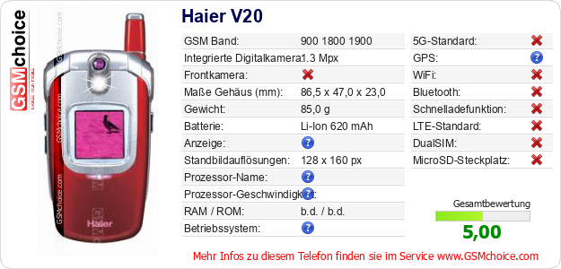 Hast du eigene Webseite? Willst du die Informationen über Standarddaten des Handys Haier V20 irgendwo veröffentlichen? Das ist sehr einfach. Du kannst das Bild herunterladen oder kopieren und auf der Webseite folgenden Code hinzufügen:Das Einfügen von diesem Code verursacht das Anzeigen von dem folgenden Bild: