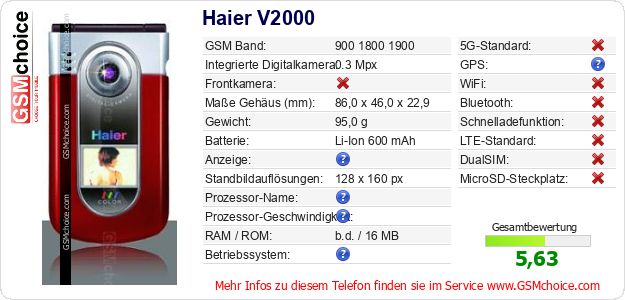 Hast du eigene Webseite? Willst du die Informationen über Standarddaten des Handys Haier V2000 irgendwo veröffentlichen? Das ist sehr einfach. Du kannst das Bild herunterladen oder kopieren und auf der Webseite folgenden Code hinzufügen:Das Einfügen von diesem Code verursacht das Anzeigen von dem folgenden Bild: