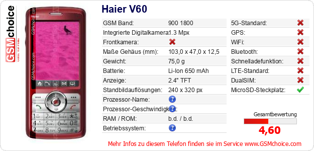 Hast du eigene Webseite? Willst du die Informationen über Standarddaten des Handys Haier V60 irgendwo veröffentlichen? Das ist sehr einfach. Du kannst das Bild herunterladen oder kopieren und auf der Webseite folgenden Code hinzufügen:Das Einfügen von diesem Code verursacht das Anzeigen von dem folgenden Bild:
