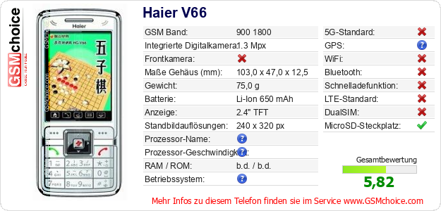 Hast du eigene Webseite? Willst du die Informationen über Standarddaten des Handys Haier V66 irgendwo veröffentlichen? Das ist sehr einfach. Du kannst das Bild herunterladen oder kopieren und auf der Webseite folgenden Code hinzufügen:Das Einfügen von diesem Code verursacht das Anzeigen von dem folgenden Bild: