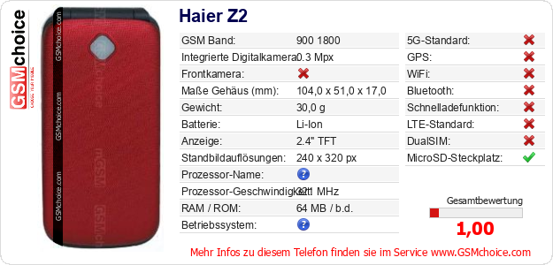 Hast du eigene Webseite? Willst du die Informationen über Standarddaten des Handys Haier Z2 irgendwo veröffentlichen? Das ist sehr einfach. Du kannst das Bild herunterladen oder kopieren und auf der Webseite folgenden Code hinzufügen:Das Einfügen von diesem Code verursacht das Anzeigen von dem folgenden Bild: