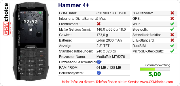 Hast du eigene Webseite? Willst du die Informationen über Standarddaten des Handys Hammer 4+ irgendwo veröffentlichen? Das ist sehr einfach. Du kannst das Bild herunterladen oder kopieren und auf der Webseite folgenden Code hinzufügen:Das Einfügen von diesem Code verursacht das Anzeigen von dem folgenden Bild: