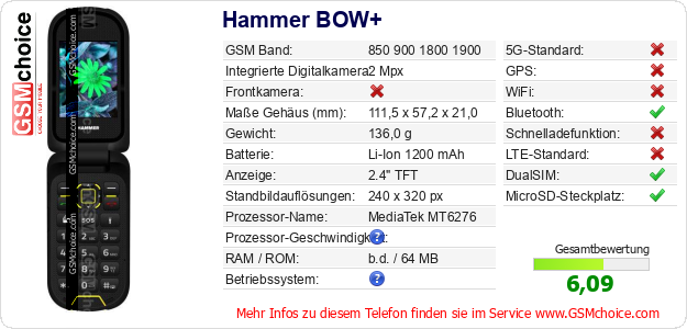 Hast du eigene Webseite? Willst du die Informationen über Standarddaten des Handys Hammer BOW+ irgendwo veröffentlichen? Das ist sehr einfach. Du kannst das Bild herunterladen oder kopieren und auf der Webseite folgenden Code hinzufügen:Das Einfügen von diesem Code verursacht das Anzeigen von dem folgenden Bild: