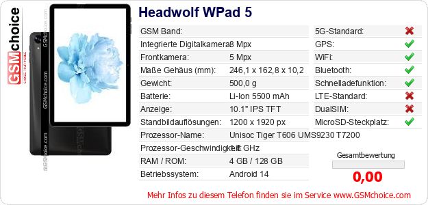 Hast du eigene Webseite? Willst du die Informationen über Standarddaten des Handys Headwolf WPad 5 irgendwo veröffentlichen? Das ist sehr einfach. Du kannst das Bild herunterladen oder kopieren und auf der Webseite folgenden Code hinzufügen:Das Einfügen von diesem Code verursacht das Anzeigen von dem folgenden Bild:
