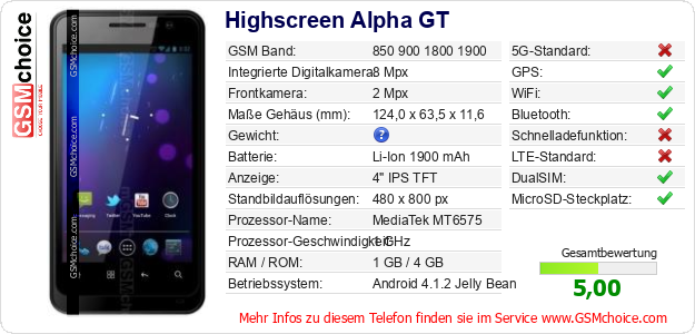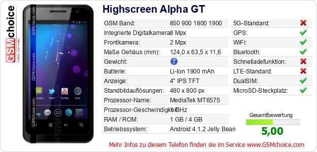 Hast du eigene Webseite? Willst du die Informationen über Standarddaten des Handys Highscreen Alpha GT irgendwo veröffentlichen? Das ist sehr einfach. Du kannst das Bild herunterladen oder kopieren und auf der Webseite folgenden Code hinzufügen:Das Einfügen von diesem Code verursacht das Anzeigen von dem folgenden Bild: