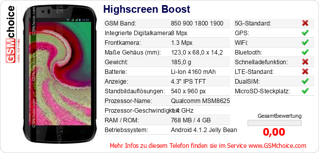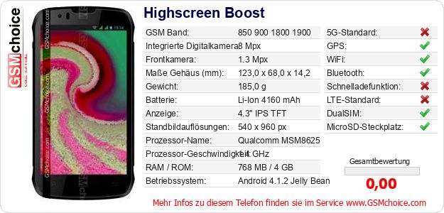 Hast du eigene Webseite? Willst du die Informationen über Standarddaten des Handys Highscreen Boost irgendwo veröffentlichen? Das ist sehr einfach. Du kannst das Bild herunterladen oder kopieren und auf der Webseite folgenden Code hinzufügen:Das Einfügen von diesem Code verursacht das Anzeigen von dem folgenden Bild: