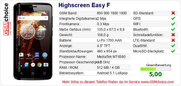 Hast du eigene Webseite? Willst du die Informationen über Standarddaten des Handys Highscreen Easy F irgendwo veröffentlichen? Das ist sehr einfach. Du kannst das Bild herunterladen oder kopieren und auf der Webseite folgenden Code hinzufügen:Das Einfügen von diesem Code verursacht das Anzeigen von dem folgenden Bild: