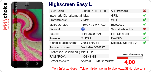 Hast du eigene Webseite? Willst du die Informationen über Standarddaten des Handys Highscreen Easy L irgendwo veröffentlichen? Das ist sehr einfach. Du kannst das Bild herunterladen oder kopieren und auf der Webseite folgenden Code hinzufügen:Das Einfügen von diesem Code verursacht das Anzeigen von dem folgenden Bild: