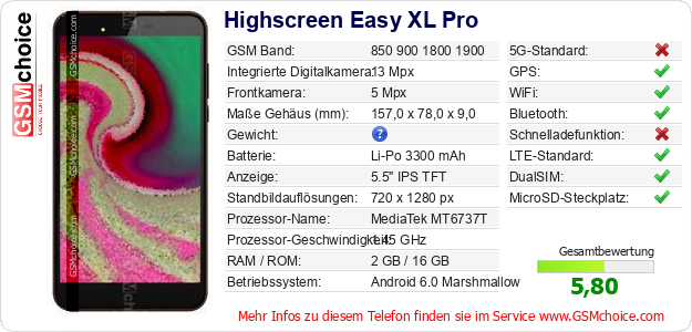 Daten des Mobiltelefons Highscreen Easy XL Pro auf Ihrer Seite