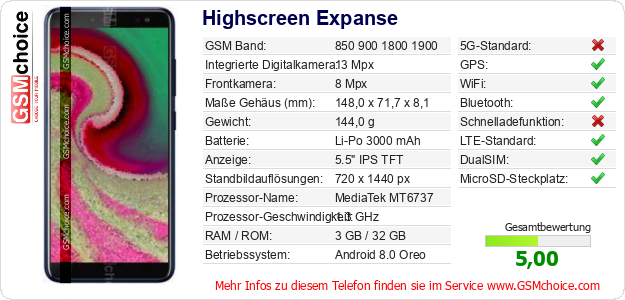 Hast du eigene Webseite? Willst du die Informationen über Standarddaten des Handys Highscreen Expanse irgendwo veröffentlichen? Das ist sehr einfach. Du kannst das Bild herunterladen oder kopieren und auf der Webseite folgenden Code hinzufügen:Das Einfügen von diesem Code verursacht das Anzeigen von dem folgenden Bild: