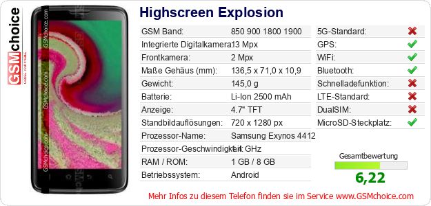 Hast du eigene Webseite? Willst du die Informationen über Standarddaten des Handys Highscreen Explosion irgendwo veröffentlichen? Das ist sehr einfach. Du kannst das Bild herunterladen oder kopieren und auf der Webseite folgenden Code hinzufügen:Das Einfügen von diesem Code verursacht das Anzeigen von dem folgenden Bild: