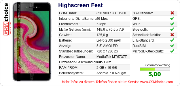 Hast du eigene Webseite? Willst du die Informationen über Standarddaten des Handys Highscreen Fest irgendwo veröffentlichen? Das ist sehr einfach. Du kannst das Bild herunterladen oder kopieren und auf der Webseite folgenden Code hinzufügen:Das Einfügen von diesem Code verursacht das Anzeigen von dem folgenden Bild: