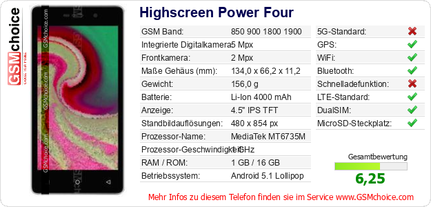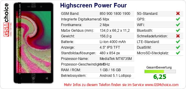 Hast du eigene Webseite? Willst du die Informationen über Standarddaten des Handys Highscreen Power Four irgendwo veröffentlichen? Das ist sehr einfach. Du kannst das Bild herunterladen oder kopieren und auf der Webseite folgenden Code hinzufügen:Das Einfügen von diesem Code verursacht das Anzeigen von dem folgenden Bild: