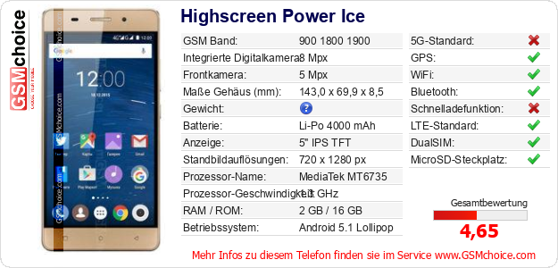 Hast du eigene Webseite? Willst du die Informationen über Standarddaten des Handys Highscreen Power Ice irgendwo veröffentlichen? Das ist sehr einfach. Du kannst das Bild herunterladen oder kopieren und auf der Webseite folgenden Code hinzufügen:Das Einfügen von diesem Code verursacht das Anzeigen von dem folgenden Bild:
