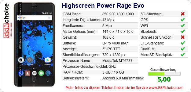 Daten des Mobiltelefons Highscreen Power Rage Evo auf Ihrer Seite