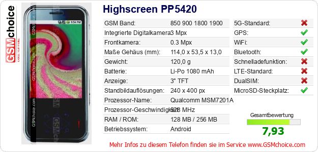 Hast du eigene Webseite? Willst du die Informationen über Standarddaten des Handys Highscreen PP5420 irgendwo veröffentlichen? Das ist sehr einfach. Du kannst das Bild herunterladen oder kopieren und auf der Webseite folgenden Code hinzufügen:Das Einfügen von diesem Code verursacht das Anzeigen von dem folgenden Bild: