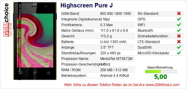 Hast du eigene Webseite? Willst du die Informationen über Standarddaten des Handys Highscreen Pure J irgendwo veröffentlichen? Das ist sehr einfach. Du kannst das Bild herunterladen oder kopieren und auf der Webseite folgenden Code hinzufügen:Das Einfügen von diesem Code verursacht das Anzeigen von dem folgenden Bild: